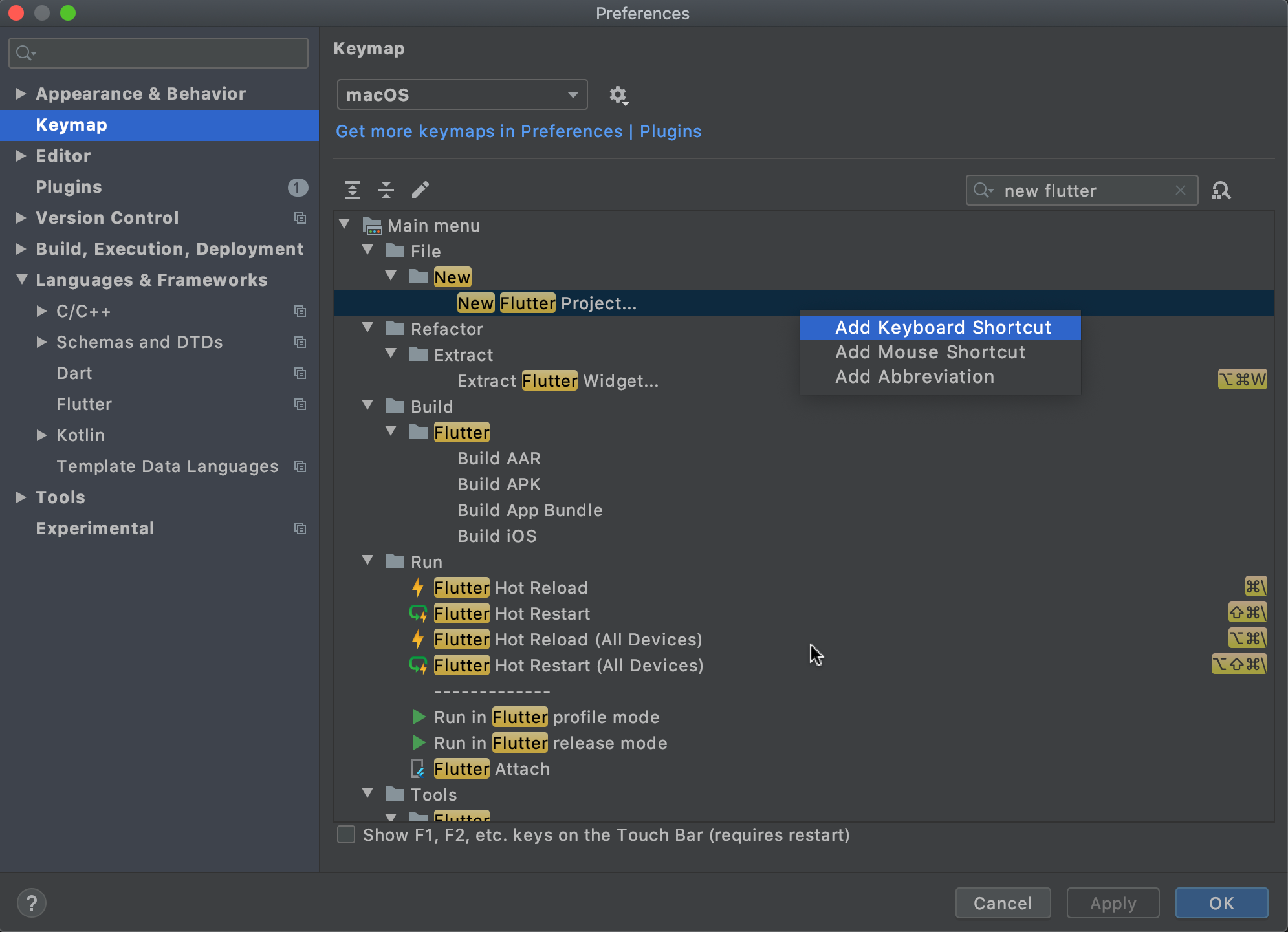 - New Flutter Project 우클릭 - Add Keyboard to Shortcut 클릭