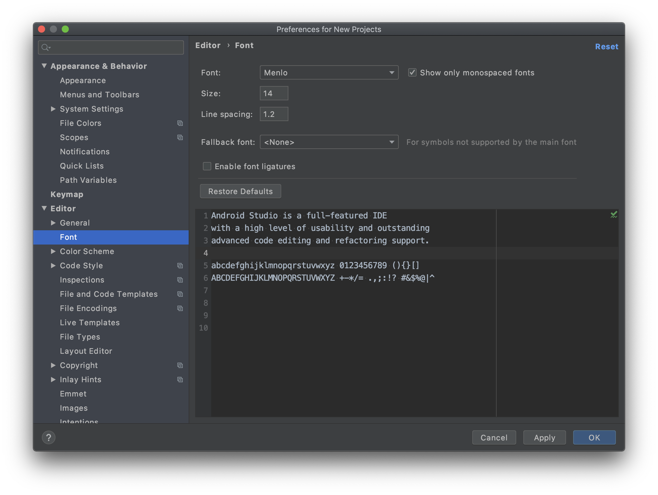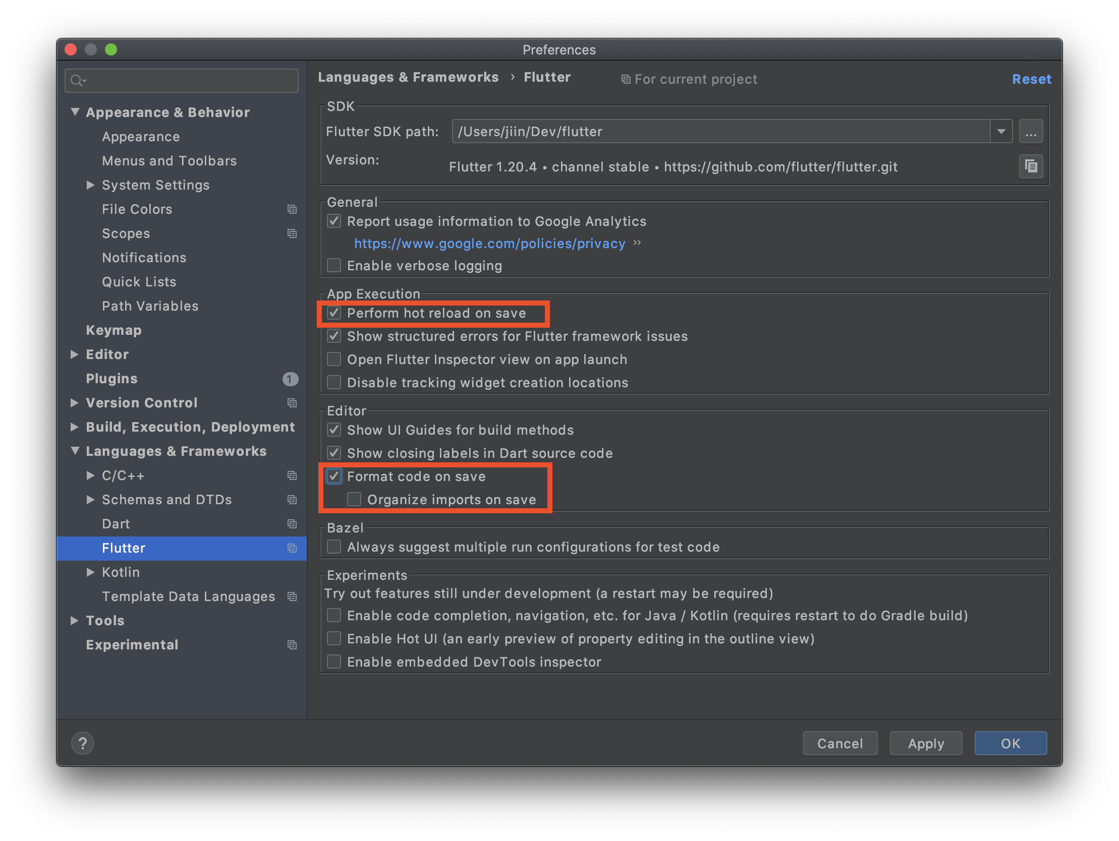 - 실제 Flutter 프로젝트를 연 다음, Prefreneces 를 다시 열어서 확인해볼 것