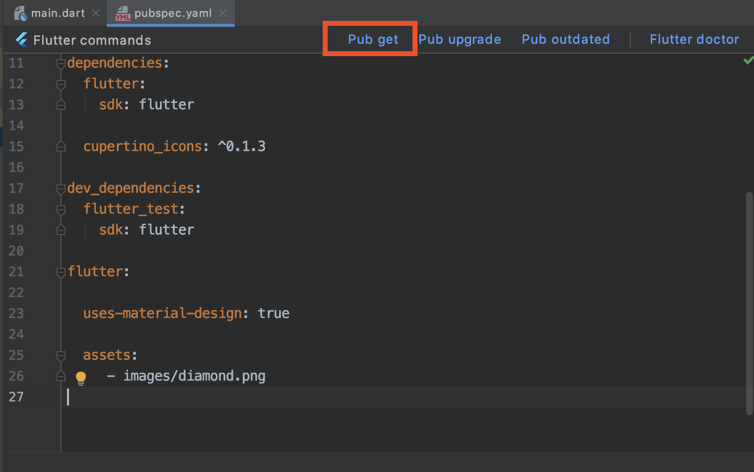 들여쓰기를 조정해준 후, 에디터 상단의 Pub get을 클릭해주면 끝!