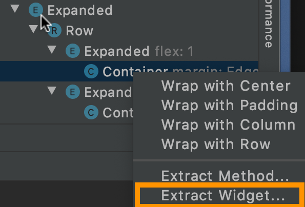 이제 Flutter Outline 의 내용이 제대로 확인이 되면, Container 위젯을 우클릭한다.