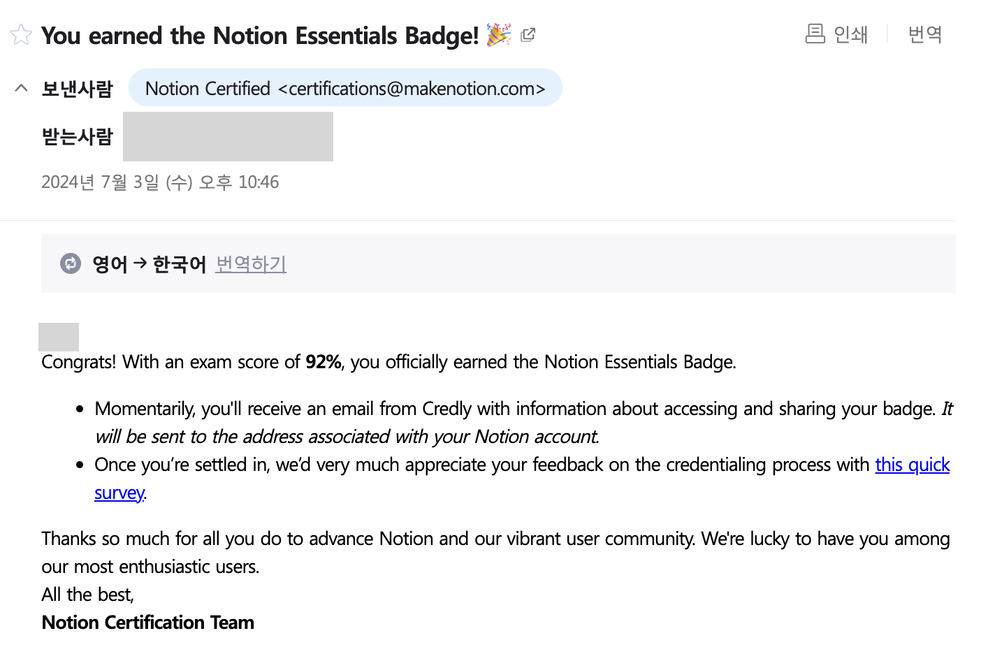 Your Notion Essentials Badge exam is ready 라는 제목으로 메일이 도착합니다.